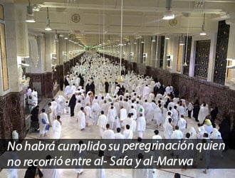 Muslim narró de Aisha, que Allah esté complacido con ella, decir: El Mensajero de Allah, la paz y las bendiciones de Allah sean con él, y los musulmanes (que estaban con él) recorrían entra as-Safa y al-Marwa y este hecho se convirtió como sunnah, y juro que no perfeccionará su Peregrinación el que no hace el recorrido entre Safa y Marwa).