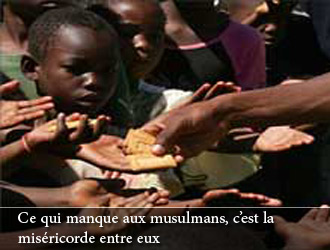 Une fois, le Prophète entendit un bébé pleurer durant la salât de Al-Fadjr (l'aube) à la mosquée. Il se pressa alors de terminer rapidement la salât, lui qui d'habitude allongeait cette salât. Lorsqu'on lui demanda pourquoi il avait agi ainsi, il répondit : “J'ai entendu un enfant appeler sa mère et j'ai senti de la compassion envers lui.” C'était là un exemple de sa miséricorde. Il tremblait de tout son être lorsqu'il voyait une bête porter une charge au-dessus de ses forces. Que penser alors de celui qui charge une nation au-dessus de ses forces ?