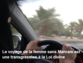 Le voyage de la femme, que ce soit en voiture ou en avion, sans un compagnon Mahram, est une violation de la loi divine. Le prophète, bénédictions et paix sur lui, a dit :