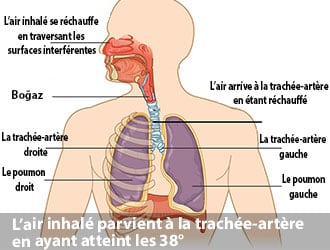 La raison ? Si tu respires par voie buccale tu entraveras un des appareils les plus délicats de ton organisme, celui justement qui réchauffe l’air froid et le purifie. A savoir qu’il existe dans le nez des surfaces interférentes renfermant des vaisseaux sanguins propres aux muscles, au cas où ces muscles se décontractent ils laisseront passer une grande quantité de sang, lorsque l’air inhalé passe à travers les surfaces interférentes et se trouve en contact direct avec la grande quantité de sang affluant vers le nez sous l’effet des muscles des vaisseaux, à ce moment-là, il se réchauffera et parviendra à la partie supérieure de la trachée-artère en ayant atteint la température de 38°.