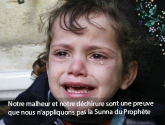 Mais, puisque nous sommes châtiés, puisque nous sommes tombés en désaccord, et puisque l'ennemi a eu de nous, le prophète n'est certainement pas avec nous, au sens précis de ce verset, nous n’observons pas sa méthode ni sa sunna dans nos maisons, ni dans nos magasins, ni dans nos marchés, ni dans nos fêtes, ni dans nos afflictions, ni dans la façon de gagner l'argent, ni dans la dépense de l'argent. A titre d'exemple, un modéliste en France et pour comble juif, décide des vêtements des femmes et conçoit pour elles des modèles séduisants auxquels malheureusement toutes les femmes musulmanes en dehors de quelques exceptions, se soumettent et les voilà habillées d’une façon scandaleuse, Donc, il n'est pas avec nous.