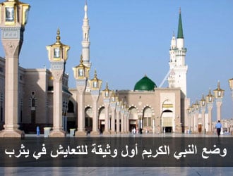 جاء في الوثيقة: << أهل يثرب أُمةٌ واحدة من دون الناس، وأنَّ يهود بني عوف أُمةٌ مع المؤمنين، لليهود دينهم، وللمسلمين دينهم، وأن بينهم النصر على من دَهَمَ يثرب، وأنه لا يحول هذا الكتاب دون ظالمٍ أو آثِم>> ، وهذا أول دستورٍ لهذه الدولة الحضارية التي قامت على التعايش، وقامت على وحدة، وقامت على مُصطلحٍ مُعاصِر المواطنة، هذا كلام سيد الخلق وحبيب الحق.