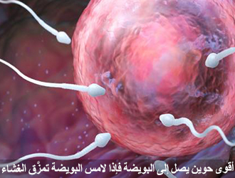 فيه غشاء تحته مادَّة نبيلة، وأقوى حوين يصل إلى البويضة، إذا لامس البويضة تمزَّق الغشاء، والمادَّة النبيلة أذابت جدار البويضة ودخل الحوين،
