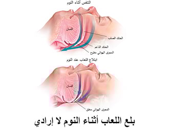 أنت نائم غارق في النوم يجتمع اللعاب في فمك، تذهب رسالة إلى الدماغ، اللعاب زاد عن حده، يأتي أمر من الدماغ وأنت نائم، يفتح البلعوم لسان المزمار يغلق القصبة الهوائية،