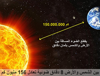 فكلمة 18 ألف مليون سنة ضوئِيَّة هل يُمكننا استيعابها؟ 13 ألف مليون سنة ضوئِيَّة بُعْدُ مجَرَّة أخرى، 150 ألف سنة ضوئِيَّة طولُ مَجَرَّتِنا، 15 ألف سنة ضَوْئِيَّة عرض مَجَرَّتِنا، 13 ساعة أقْصى بُعد بين المجموعة الشَّمْسِيَّة، الشمسُ ثمانِيَ دقائق والقمرُ ثانِيَة، فإذا كان بُعد القمر ثانِيَة وصعد الإنسان للقمر وركِبَ مرْكَبَةً تسير بِسرعة 40 ألف كم في الساعة، ووصَلَهُ بعد ثلاثة أيام، وكَلَّفَتْ هذه الرِّحْلة 24 ألف مليون دولار، وقد قطع الإنسان في الفضاء الخارجي ثانِيَةً ضَوْئِيَّةً واحدة، فَكَيْفَ لو كُلِّفَ بِقَطْع ثماني دقائق؟! بعدُ الأرض عن الشمس 156 مليون كم،