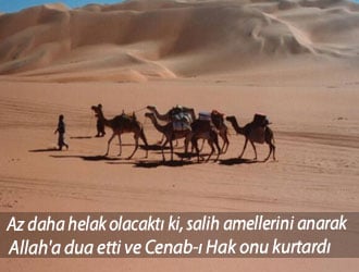 Bana büyük koyun tüccarlarından biri anlattı. Şöyle ki O, satın aldığı koyunları ile birlikte çölde kayboldu. O ve koyunları neredeyse susuzluktan öleceklerdi. İki rekat namaz kıldı ve yıllar önce yaptığı iyi bir ameli hatırladı. O çöldeyken bir kadın ona ahlaksız bir teklifte bulunmuş, o ise