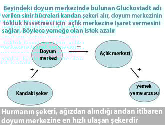 Mesela zayıflamak için bazı ilaçlar vardır. Bu ilaçların yaptığı şey aslında bu merkezi etkilemektir. Varlıkların efendisi ve Hakk’ın sevgilisi olan Rasulullah (s.a.v.) (iftarda) üç hurma yememizi tavsiye etmiştir ve bu O’nun sünnetidir. Günümüzde de hurmanın şekerinin en hızlı etkileşime geçen şeker olduğu keşfedilmiştir. Şeker ağızdan alınır on dakika içinde kana, ardından da doyum merkezine ulaşır.