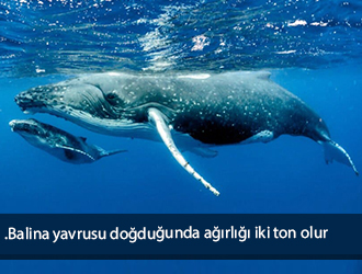 Dişi balinadan yavru doğduğunda kilosu iki ton, uzunluğu da yedi metre olur. Tek seferde emdiği süt üç yüz kiloyu aşar. Yavrunun günde bir ton süte ihtiyacı vardır. Bir mavi balinanın günlük ortalama öğünü –arttırmak istemezse- dört tondur.