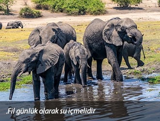 Şüphesiz filin yakıcı güneş altında suya ihtiyacı vardır. Bu sebeple günlük olarak bir su kaynağına gitmek zorundadırlar.