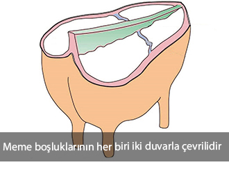 Hayvan memesine otopsi yapıldıktan sonra görüldü ki içerisinde birbirine zıt iki duvar var. Eğer dört yavrunun bir annesi varsa, o ineğin dört meme başı oluyor. Her meme üretimini tam olarak dörtte bir azaltıyor. Memede düz kaslardan bir duvar oluşuyor.